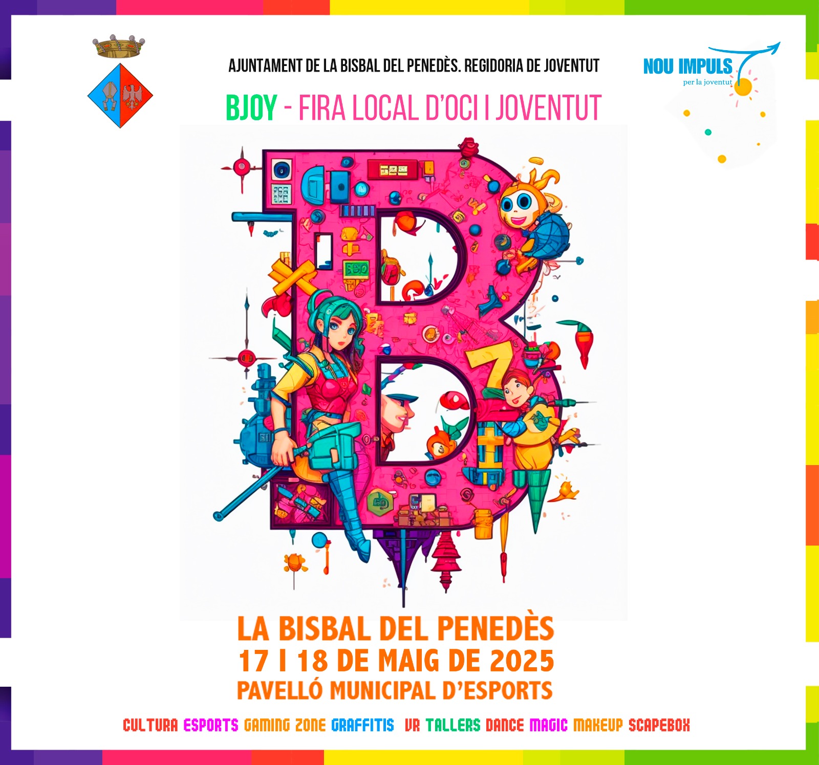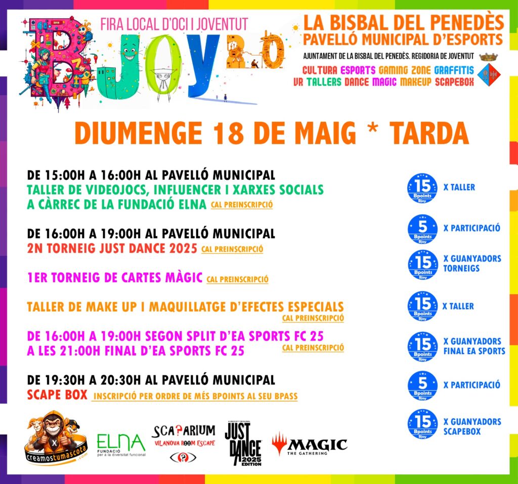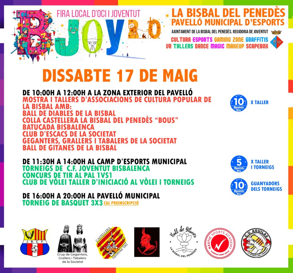 El sábado 17 y el domingo 18 de mayo, el Pabellón Deportivo Municipal de La Bisbal del Penedès acogerá el BJOY: la Feria local de Ocio y Juventud. Es el segundo año consecutivo que la Regidoria de Joventut saca adelante este evento en la zona deportiva municipal con el objetivo de ofrecer un fin de semana repleto de actividades dirigido a jóvenes de entre 11 y 25 años del municipio y los alrededores.