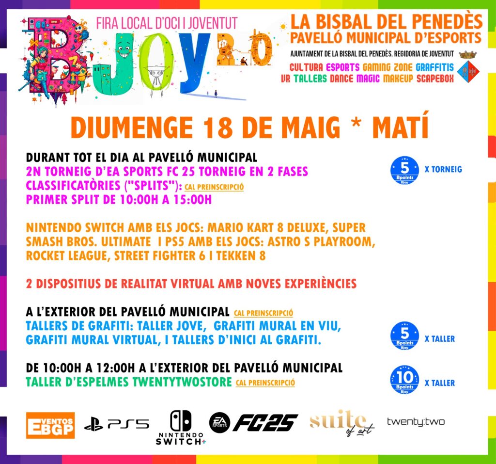 El diumenge hi haurà activitats que es duran a terme durant tot el dia, com ara el 2n torneig d’EA Sports FC 25, els videojocs i al realitat virtual. També hi haurà tallers de grafiti durant tota la jornada. A partir de les 10h també s’oferirà un taller d’espelmes Twentytwostore.