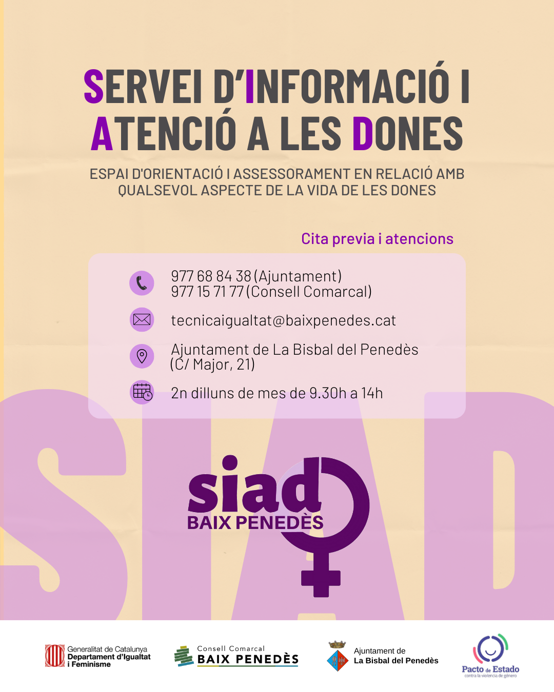 El Servei d’Informació i Atenció a les Dones (SIAD) ha actualizado su horario. Os adjuntamos el cartel con la información.
