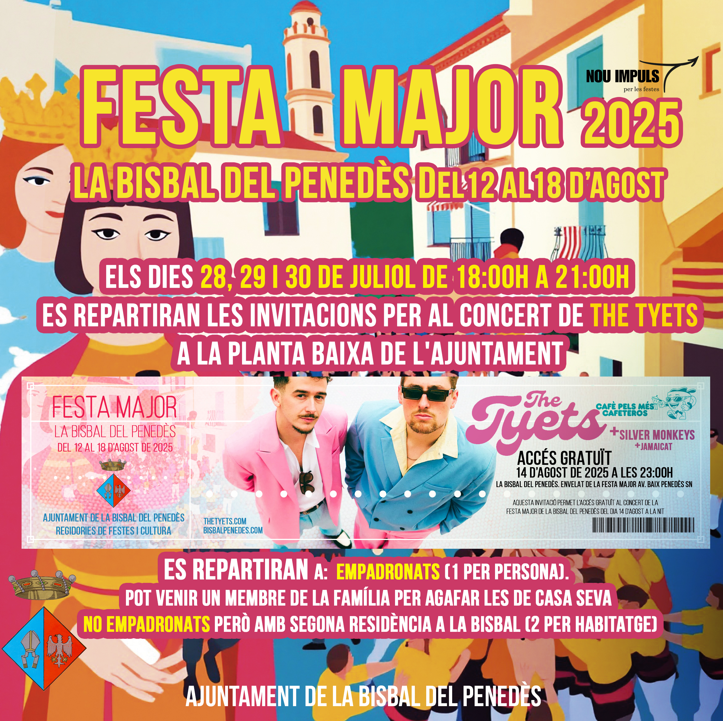 Els empadronats i els no empadronats amb residència a la Bisbal podreu recollir les invitacions per al concert de The Tyets + Silver Monkeys + Jamaicat els dies 28, 29 i 30 de juliol de 18 a 21h a la planta baixa de l’Ajuntament. Més info a la imatge.