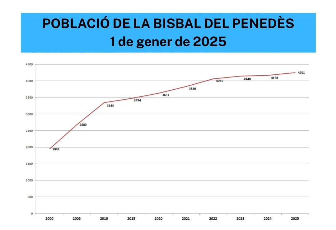 El padró d’habitants de la Bisbal del Penedès ascendia a 4.251 habitants l’1 de gener de 2025