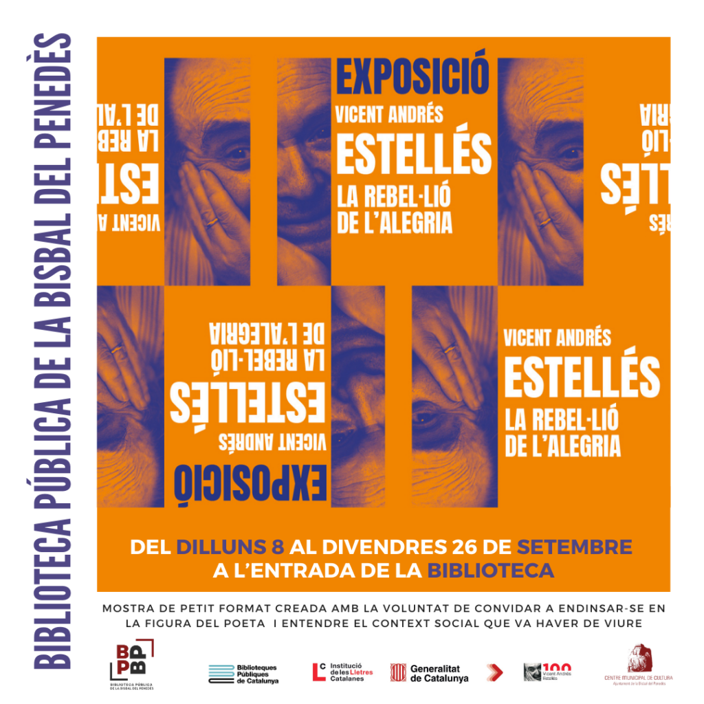 Del lunes 8 al viernes 26 de septiembre podréis visitar la exposición “La Rebel·lió de l’Alegria”, dedicada a Vicent Andrés Estellés, en la entrada de la Biblioteca (CMC). Se trata de una muestra de pequeño formato creada con la voluntad de invitaros a adentraros en la figura del poeta y entender el contexto social que vivió.