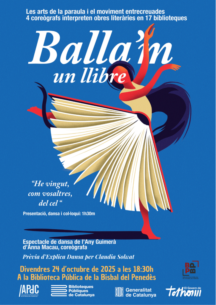 A més de l’exposició, la biblioteca acollirà el divendres el 24 d’octubre a les 18:30h el cicle Balla’m un llibre, un projecte de la Generalitat de Catalunya i APdC (Associació Professionals de la Dansa de Catalunya) per apropar la dansa contemporània a les biblioteques a partir de coreografies breus inspirades en textos literaris. La biblioteca de la Bisbal acollirà la representació de He vingut, com vosaltres, del cel, a càrrec d’Anna Macau. Una peça de dansa contemporània que proposa un recorregut per la vida i l’univers de l’Àngel Guimerà a partir de la seva obra literària. L’execució de la peça anirà precedida d’Explica Dansa: llegir el moviment, una conferència ballada, pedagògica i amena a càrrec de Claudia Solwat, per fer entendre com la proposta de la companyia ha relacionat la dansa contemporània i la literatura; i acabarà amb un col·loqui amb la companyia.