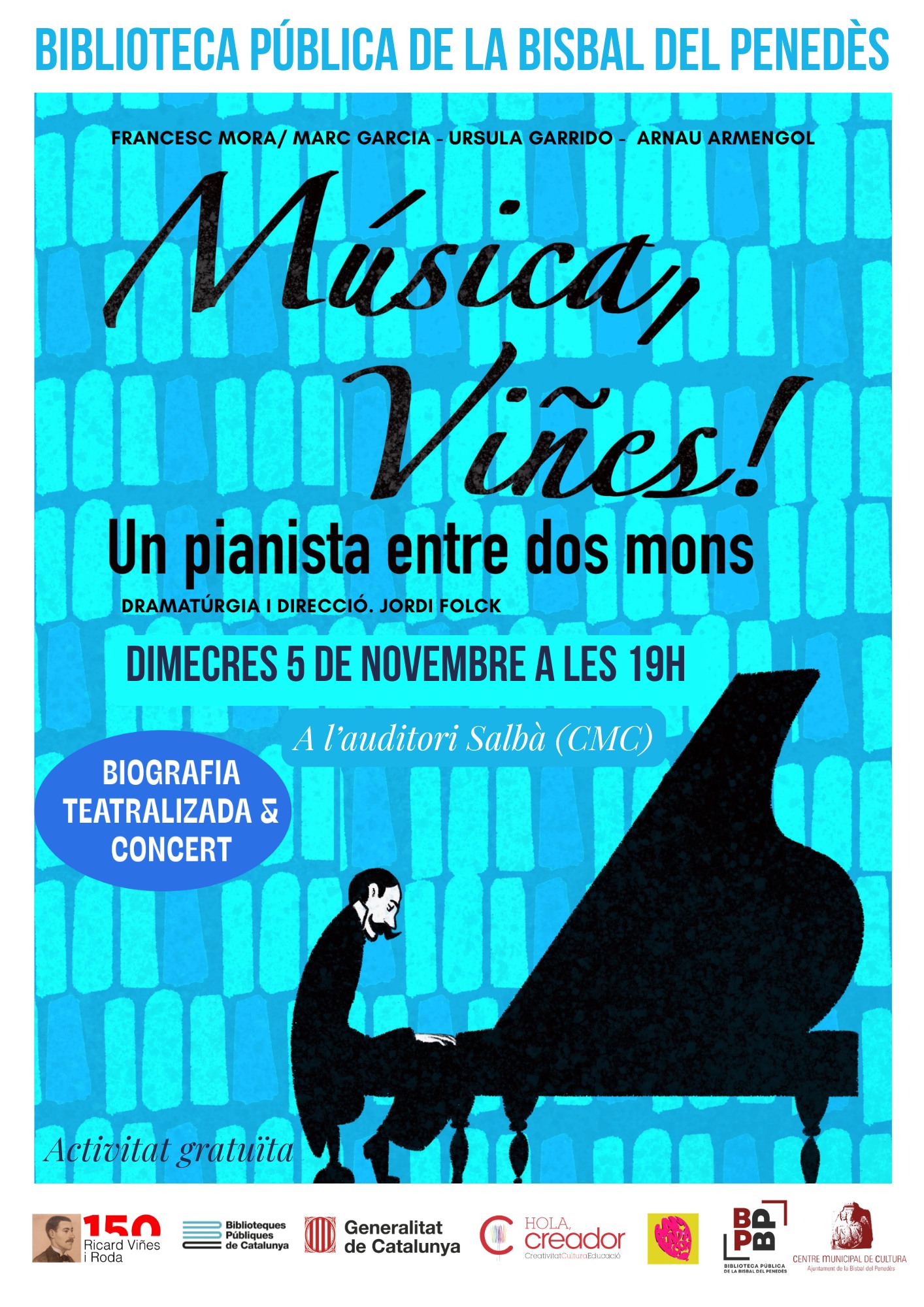 El próximo miércoles 5 de noviembre, a las 19h, el auditorio Salbà del Centre Municipal de Cultura acogerá el espectáculo musical Música, Viñes! Un pianista entre dos mons. Se trata de un espectáculo musical apto para todos los públicos que recrea la vida de Ricard Viñes en el marco de la conmemoración de los 150 años del nacimiento del pianista de Lleida. El espectáculo irá a cargo de Francesc Mora, Marc Garcia, Ursula Garrido y Arnau Armengol. La dramaturgia y la dirección han ido a cargo de Jordi Folck.