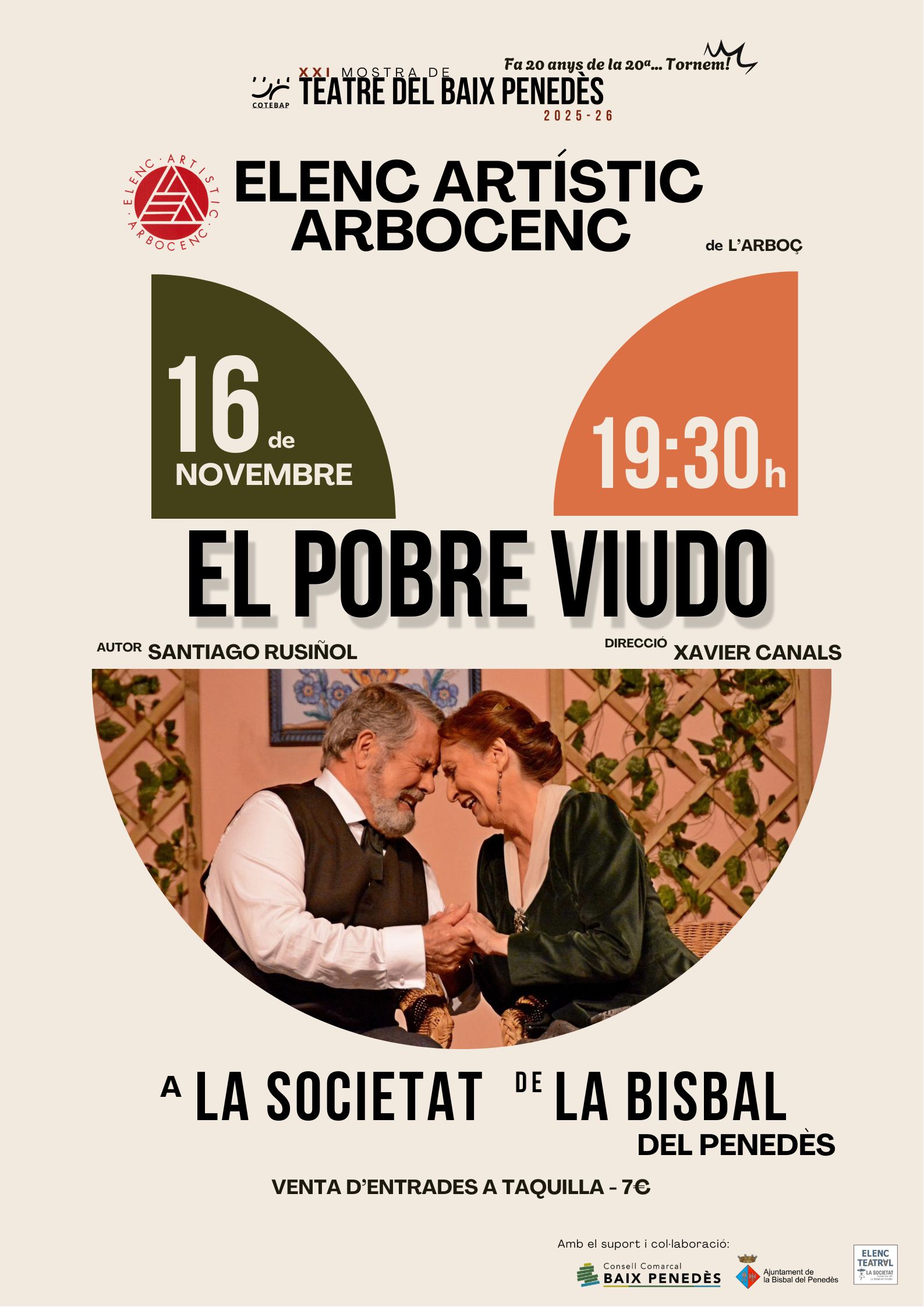 El domingo 16 de noviembre, en el marco de la “Mostra de teatre del Baix Penedès” de la Cotebap, podréis disfrutar de la representación de la comedia “Pobre viudo” de Santiago Rusiñol a cargo del Elenc artístic arbocenc, en la Societat.