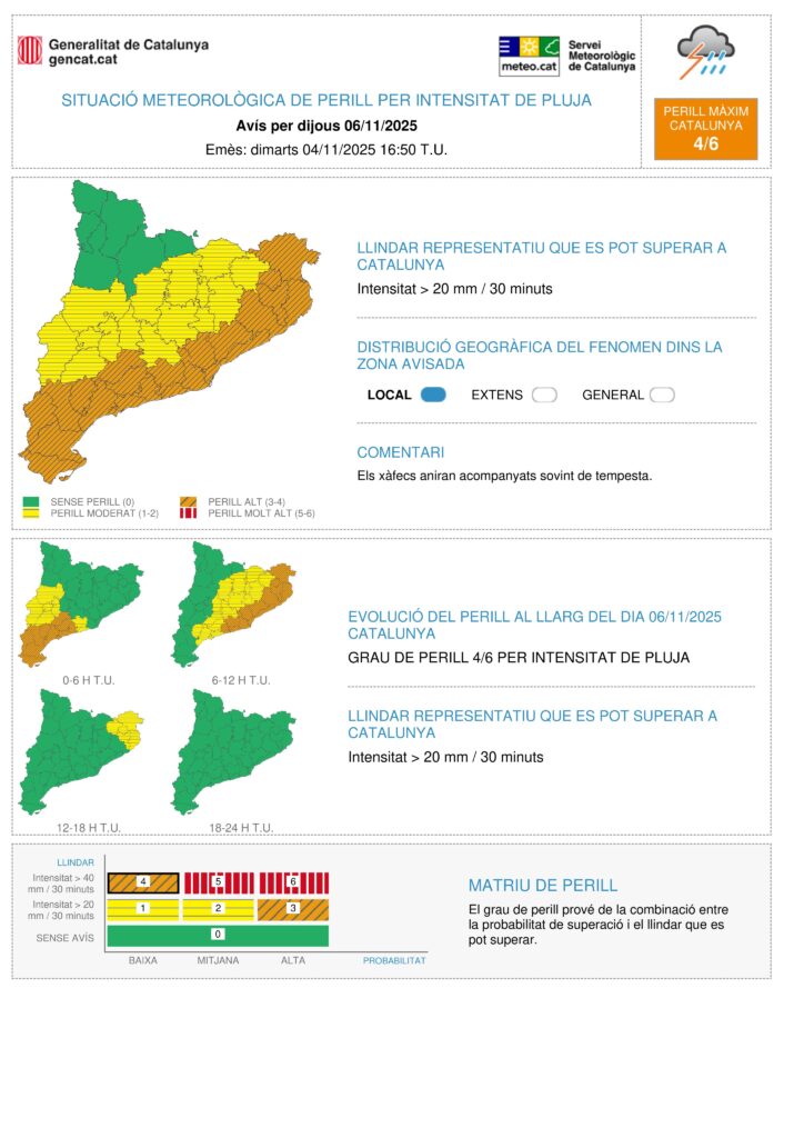 ⚠️ El Servei Meteorològic de Catalunya ha publicat un avís per intensitat de pluja des de la matinada de dijous 6/11 al litoral i prelitoral sud, que s’estendrà al matí i migdia al litoral central i nord.