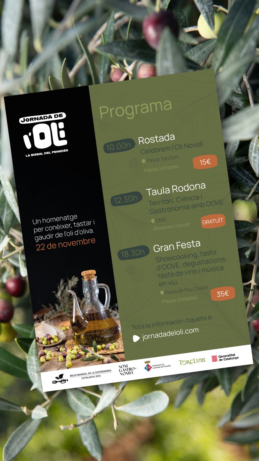 La primera Jornada de l’Oli de la Bisbal del Penedès neix amb la voluntat de reivindicar l’oli com a patrimoni viu, com a part essencial del territori i com a motor de creació gastronòmica i cultural. Les persones interessades poden consultar tota la programació i adquirir els tiquets (rostada i gran festa) al web oficial: https://jornadadeloli.com/. Important: les places per a totes les activitats són limitades.