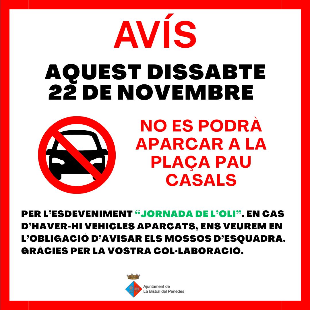 Aquest dissabte no es podrà aparcar a la plaça Pau Casals en tot el dia per la celebració de la “Jornada de l’oli”. Gràcies per la vostra comprensió.