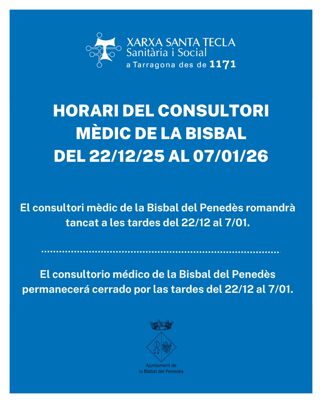 Us informem que el consultori mèdic de la Bisbal del Penedès romandrà tancat les tardes del 22 de desembre al 7 de gener.