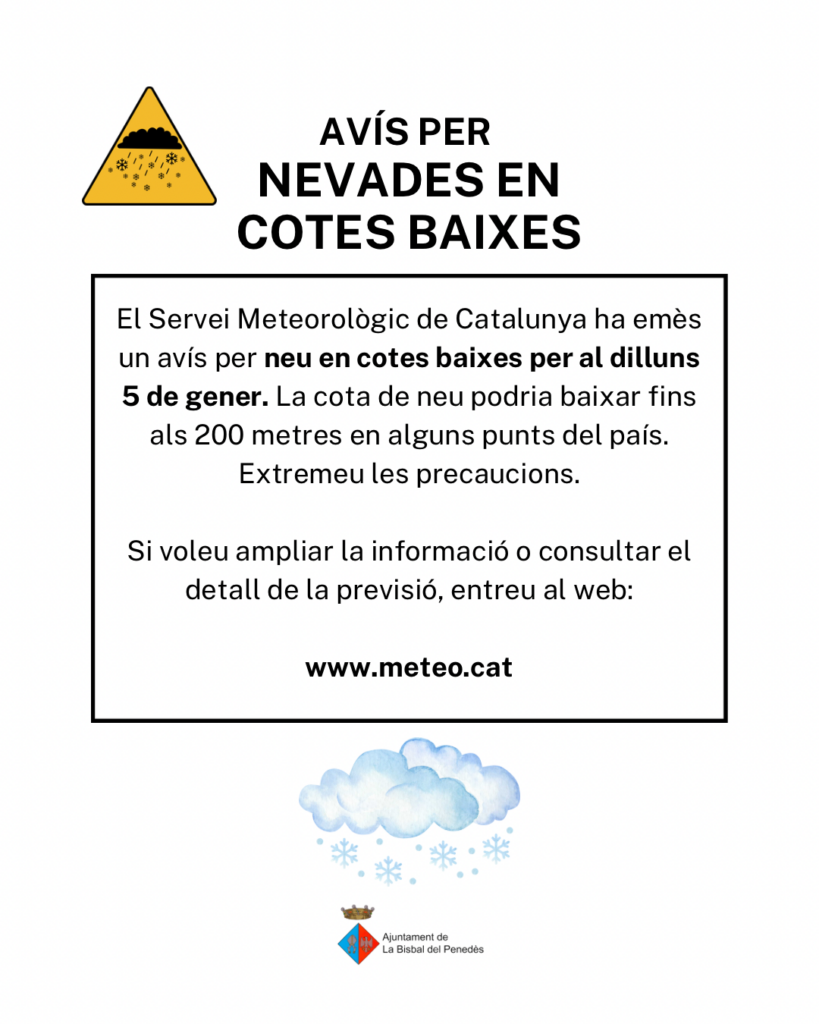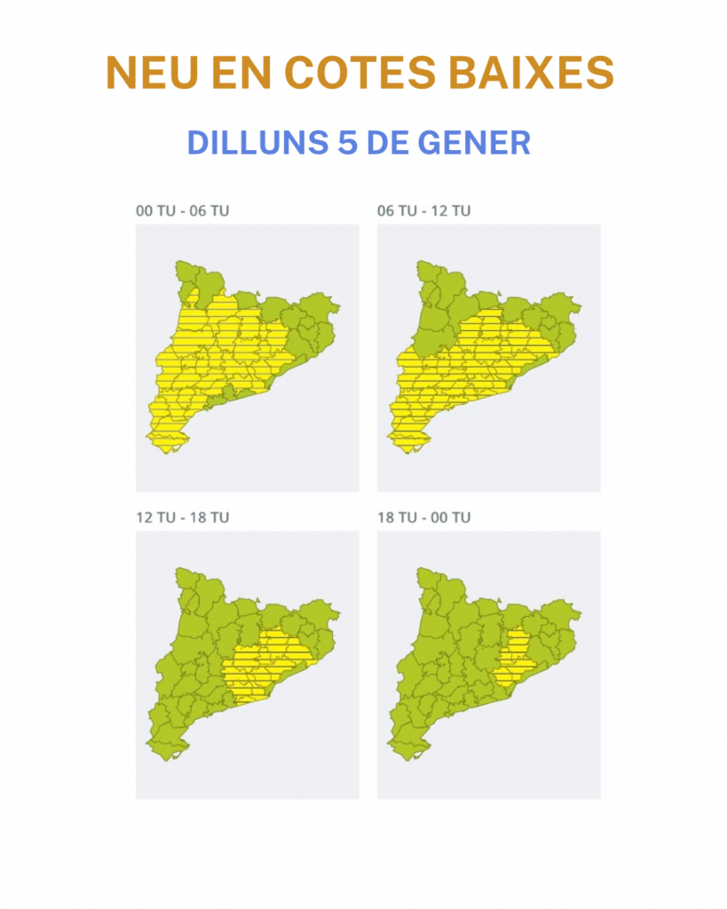 El Servei Meteorològic de Catalunya ha emitido un aviso por nieve en cotas bajas para el lunes 5 de enero. La cota de nieve podría bajar hasta los 200 metros en algunos puntos del país. Extremad las precauciones.