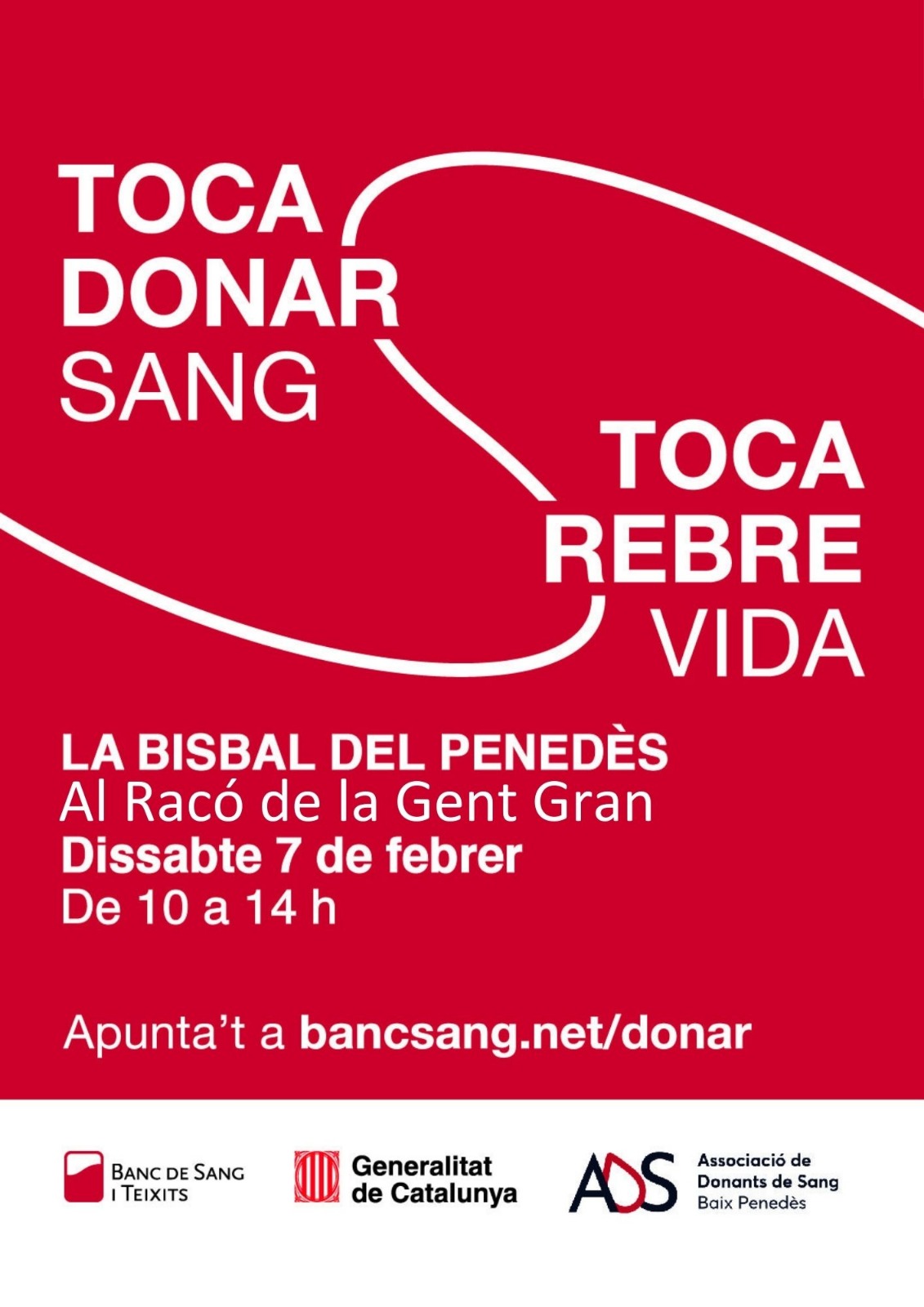El pròxim dissabte 7 de febrer, de 10 a 14h, podreu donar sang a la Bisbal del Penedès, al Racó de la Gent Gran.