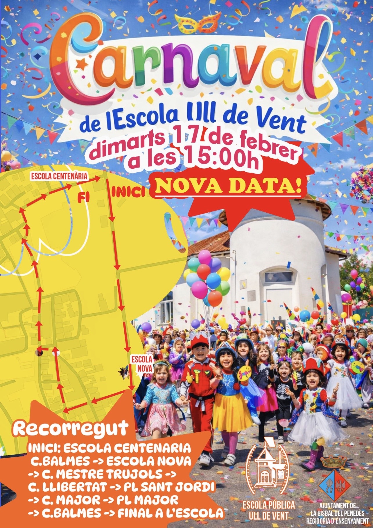 La rua de Carnaval de l’escola Ull de Vent, prevista inicialment per avui divendres 13 de febrer, es trasllada al dimarts 17 de febrer a les 15 h.