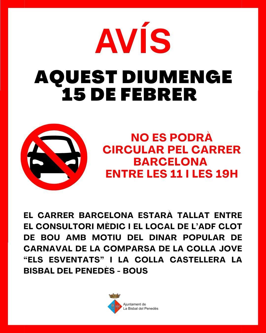Mañana domingo, entre las 11 y las 19 h, la calle Barcelona estará cortada en el tramo comprendido entre el consultorio médico y el local de la ADF Clot de Bou con motivo de la comida popular de Carnaval organizada por la comparsa de la asociación de jóvenes Els Esventats con la colaboración de la Colla Castellera La Bisbal del Penedès – Els Bous.