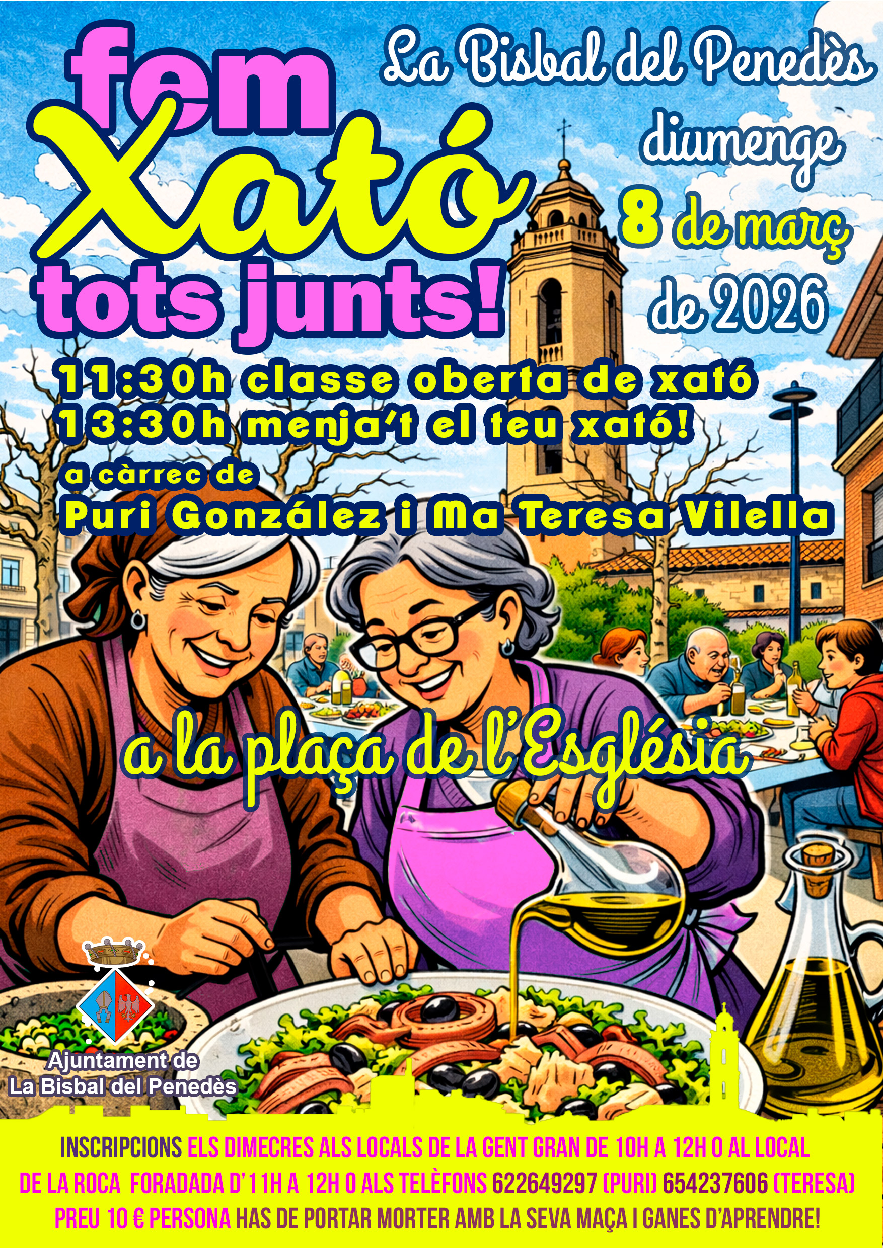 A les 11.30 h tindrà lloc una classe oberta de xató, a càrrec de les presidentes de l’Associació de Dones La Roca Foradada, Puri González, i l’Associació de la Gent Gran, M. Teresa Vilella. Posteriorment, a les 13.30 h, les persones participants podran degustar el seu propi xató.