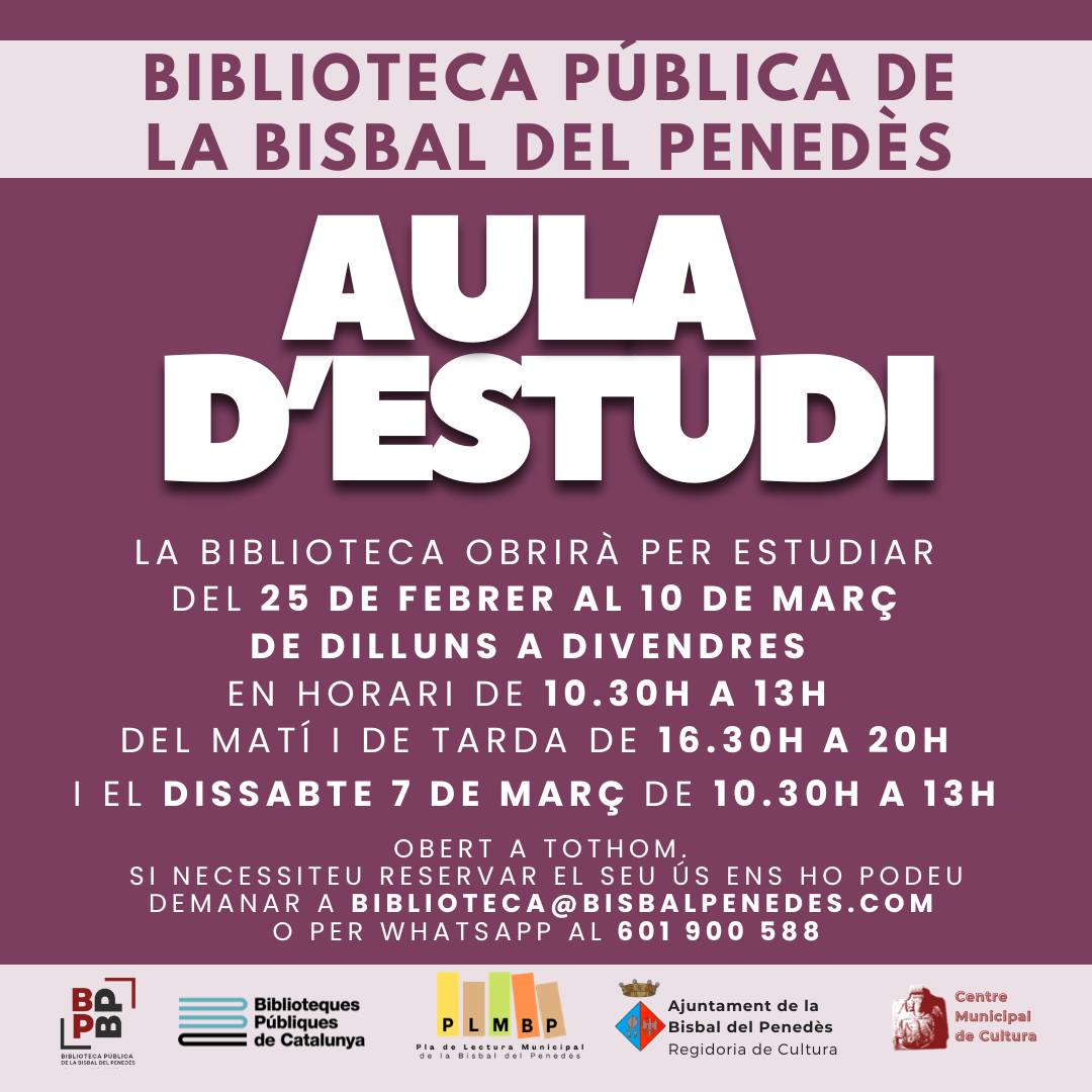 Para gestionar correctamente el aforo y el uso del espacio, podéis consultar o poneros en contacto con la biblioteca, previamente, a través del correo electrónico biblioteca@bisbalpenedes.com o del WhatsApp 601 900 588