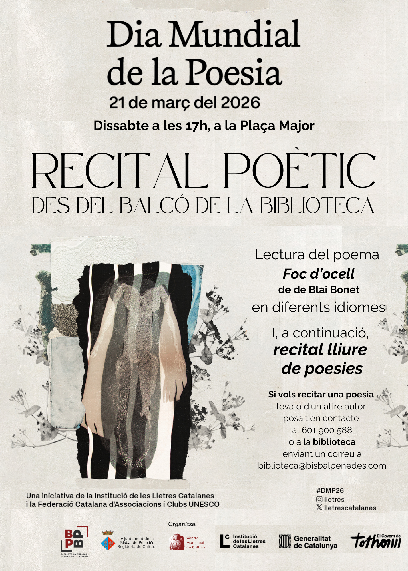 La iniciativa quiere acercar la poesía al espacio público y compartirla con toda la ciudadanía. Desde el balcón se leerá el poema escogido para la decimonovena edición del Día Mundial de la Poesía, “Foc d’ocell”, en diferentes lenguas y, después, los participantes podrán recitar otras obras propias o de otros autores. Si queréis recitar uno o varios poemas, os podéis dirigir a la Biblioteca de forma presencial o por correo electrónico: biblioteca@bisbalpenedes.com
